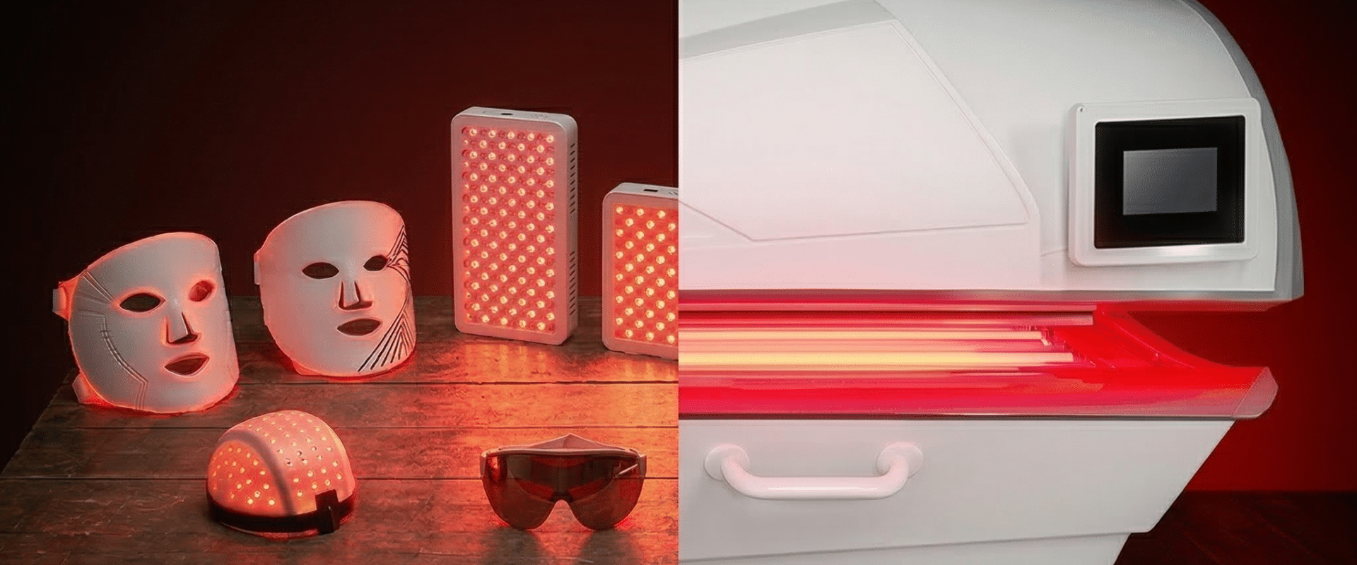 Our team assesses individual goals, tracks progress, and selects from six pod presets optimized for different conditions. A home panel offers red, NIR, or a 50/50 mix — a much blunter instrument. We also screen for contraindications that home users may overlook.